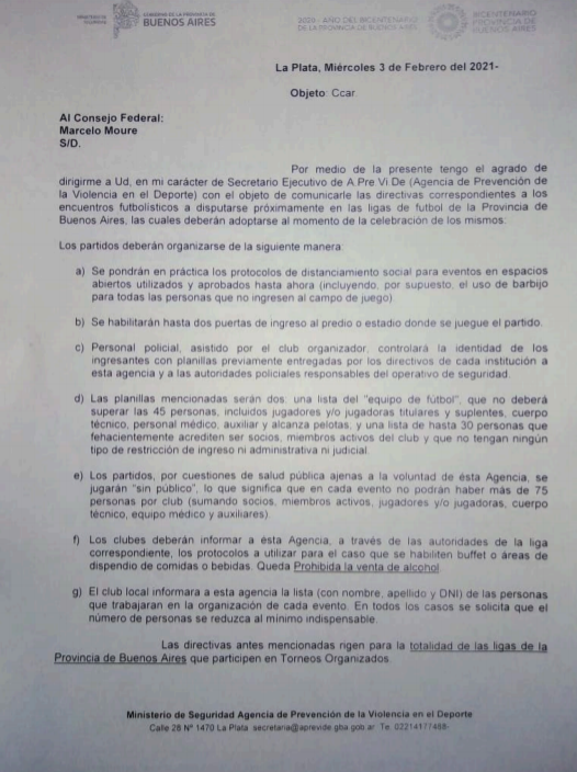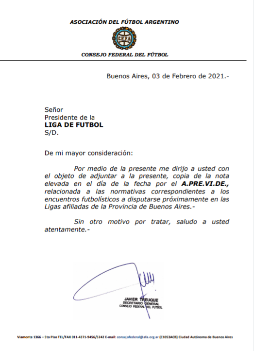 Esta comunicación ha sido recibida en el día de hoy por nuestra Liga y las demás Ligas de nuestra Provincia de parte del Consejo Federal y del A.PRE.VI.DE…