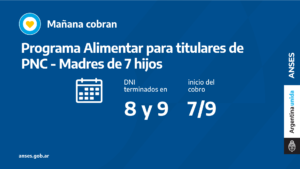 En el marco del Plan Argentina contra el Hambre del Ministerio de Desarrollo Social, la ANSES acompaña con el pago del programa Alimentar. Mañana cobran Madres de 7 hijos que perciben PNC con documentos finalizados en 8 y 9, no poseen la tarjeta plástica y reciben el dinero en la misma cuenta de la prestación.