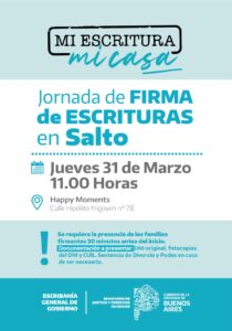 La jornada de escrituración se realizará el jueves 31 de marzo, a las 11 hs, en Happy Moments ubicado en calle Hipólito Yrigoyen n° 73, donde las familias beneficiarias deberán asistir con DNI, fotocopia del DNI y CUIL, y, en caso de ser necesario, sentencia de divorcio y poder.