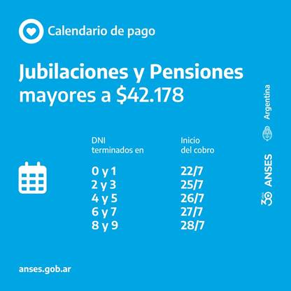 ANSES informa que hoy comienza el pago de jubilaciones y pensiones que SUPERAN la suma de 42.178 pesos.