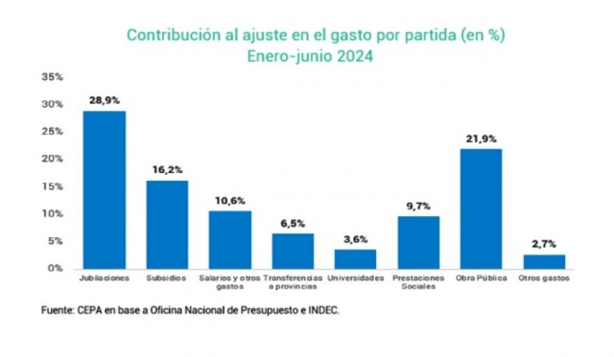 De acuerdo con un estudio del Centro Política Económica Argentina (CEPA), en base a datos oficiales, el Sector Público Nacional (SPN) registró un superávit fiscal para el primer semestre de $ 238.189 millones, gracias al ajuste de gasto realizado en los siguientes rubros: Jubilaciones 28,9%; Obra Pública 21,9%; Subsidios 16,2%; Salarios, 10,6%; Prestaciones sociales, 9,7%; Transferencias a las provincias, 6,5%; Universidades, 3,6%, y Otros gastos, 2,7%.