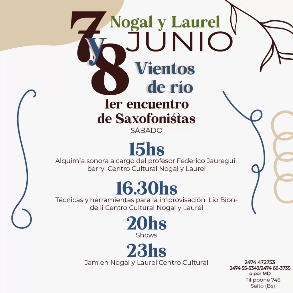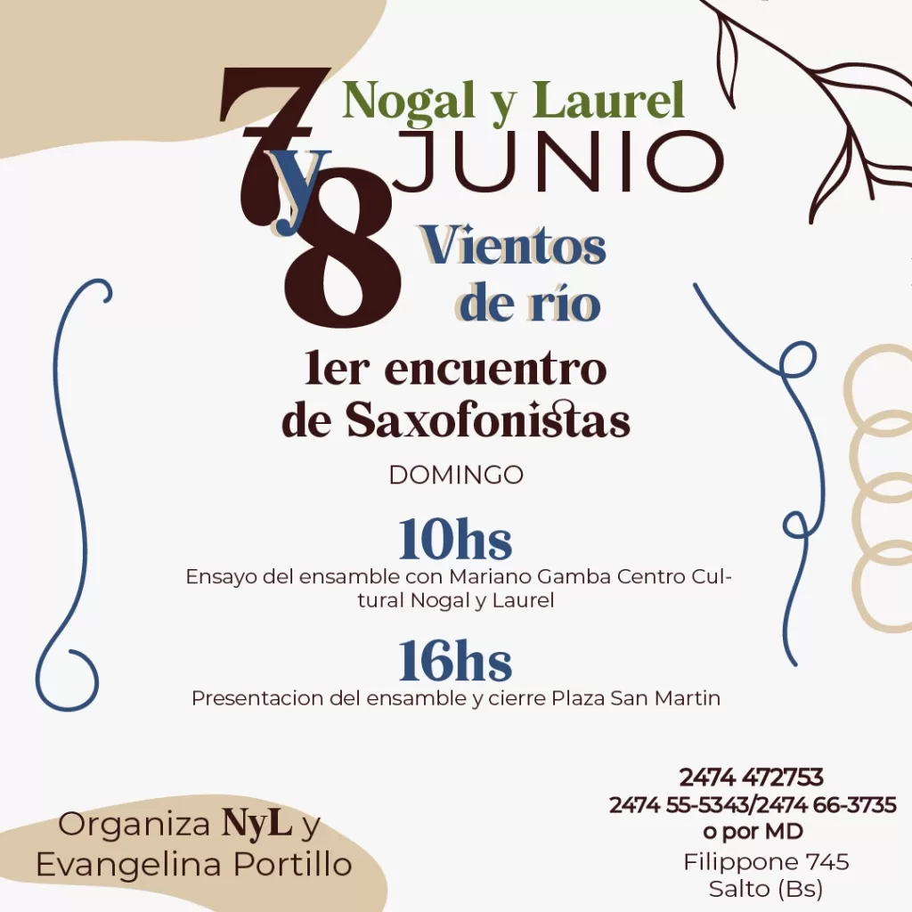 (Salto – junio 2) Organizado por la agradable gente de «Nogal y Laurel» y Evangelina Portillo y auspiciado por la Municipalidad de Salto a través de su Dirección de Cultura, el próximo fin de semana se realizará en esta ciudad una serie de talleres de formación musical para saxofonistas invitados de todo el país.