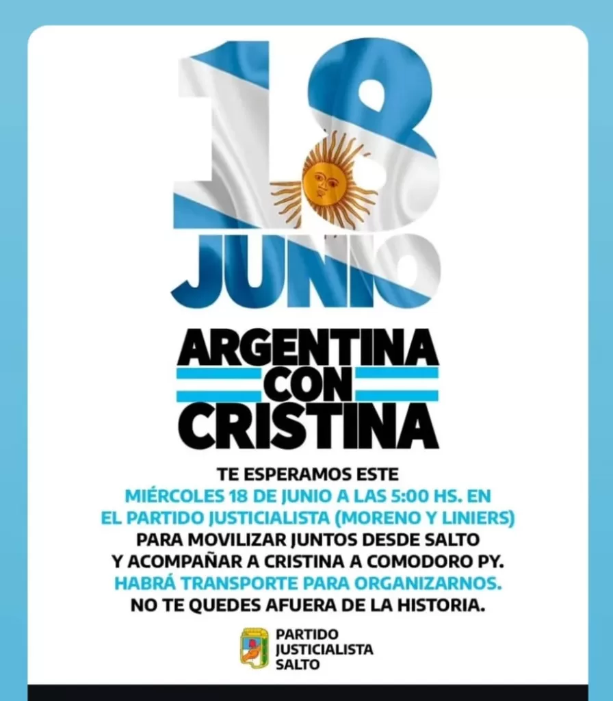 También en Salto, donde luego de la confirmación de la condena a Cristina nada se había hecho, salvo la difusión de un tibio comunicado, a partir de ayer se comenzó a hacer circular la convocatoria para acompañar a Cristina el día miércoles, concentrando a las 05,00 hs en la sede partidaria del Justicialismo local (calle Moreno y Liniers), desde donde se partirá hacia CABA a bordo de colectivos que a tal efecto estarán a disposición de la militancia.