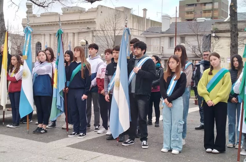 El izamiento de Banderas e inmediato arrío de las misma a media asta con la posterior entonación del Himno Nacional Argentino, marcaron la apertura del acto conmemorativo que contó con la presencia, además de autoridades municipales, de delegaciones estudiantiles, institucionales y vecinos de la ciudad.