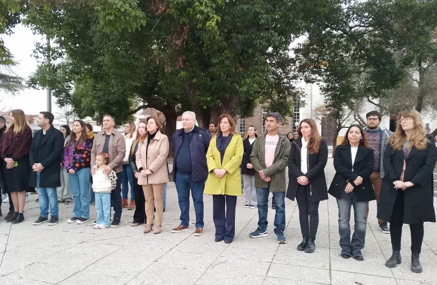 El izamiento de Banderas e inmediato arrío de las misma a media asta con la posterior entonación del Himno Nacional Argentino, marcaron la apertura del acto conmemorativo que contó con la presencia, además de autoridades municipales, de delegaciones estudiantiles, institucionales y vecinos de la ciudad.